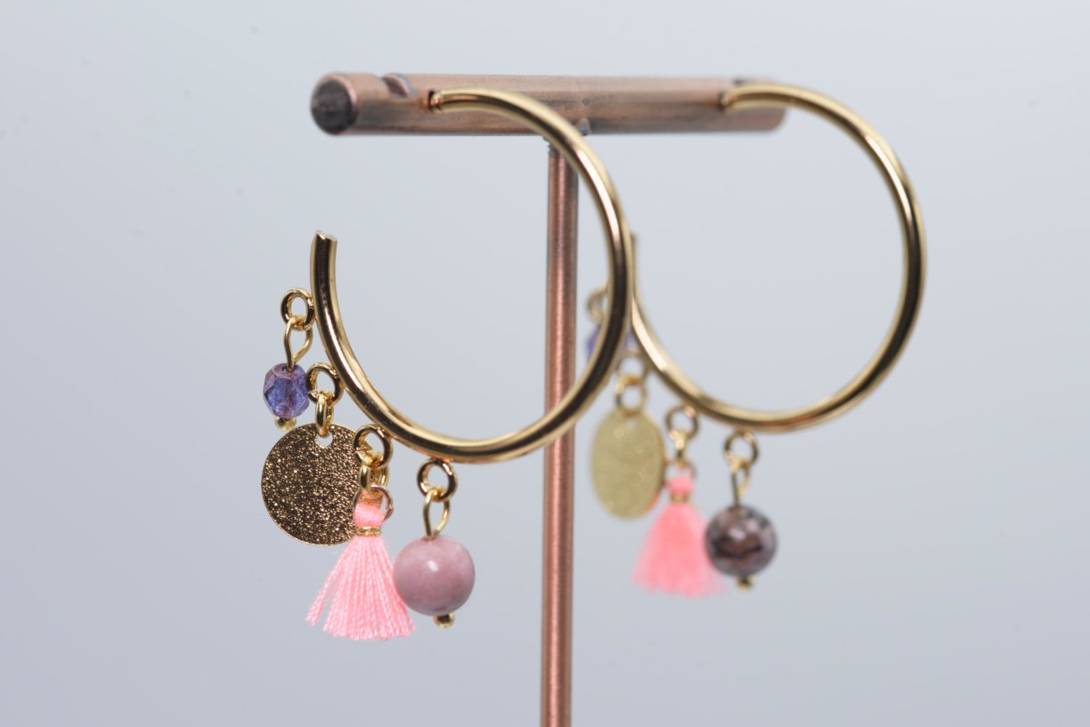 Acier inoxydable, pierre 6mm, verre de bohème 4mm, diamètre boucle 3cm