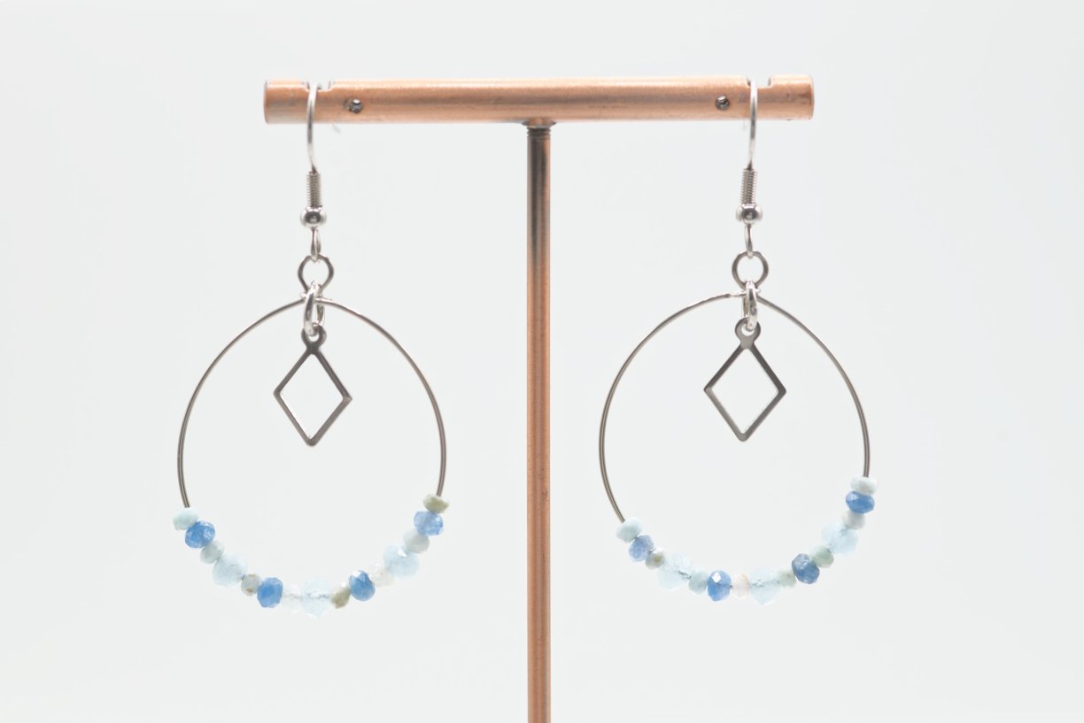 Boucles d’oreilles créoles Aigue marine, Cyanite, Larimar