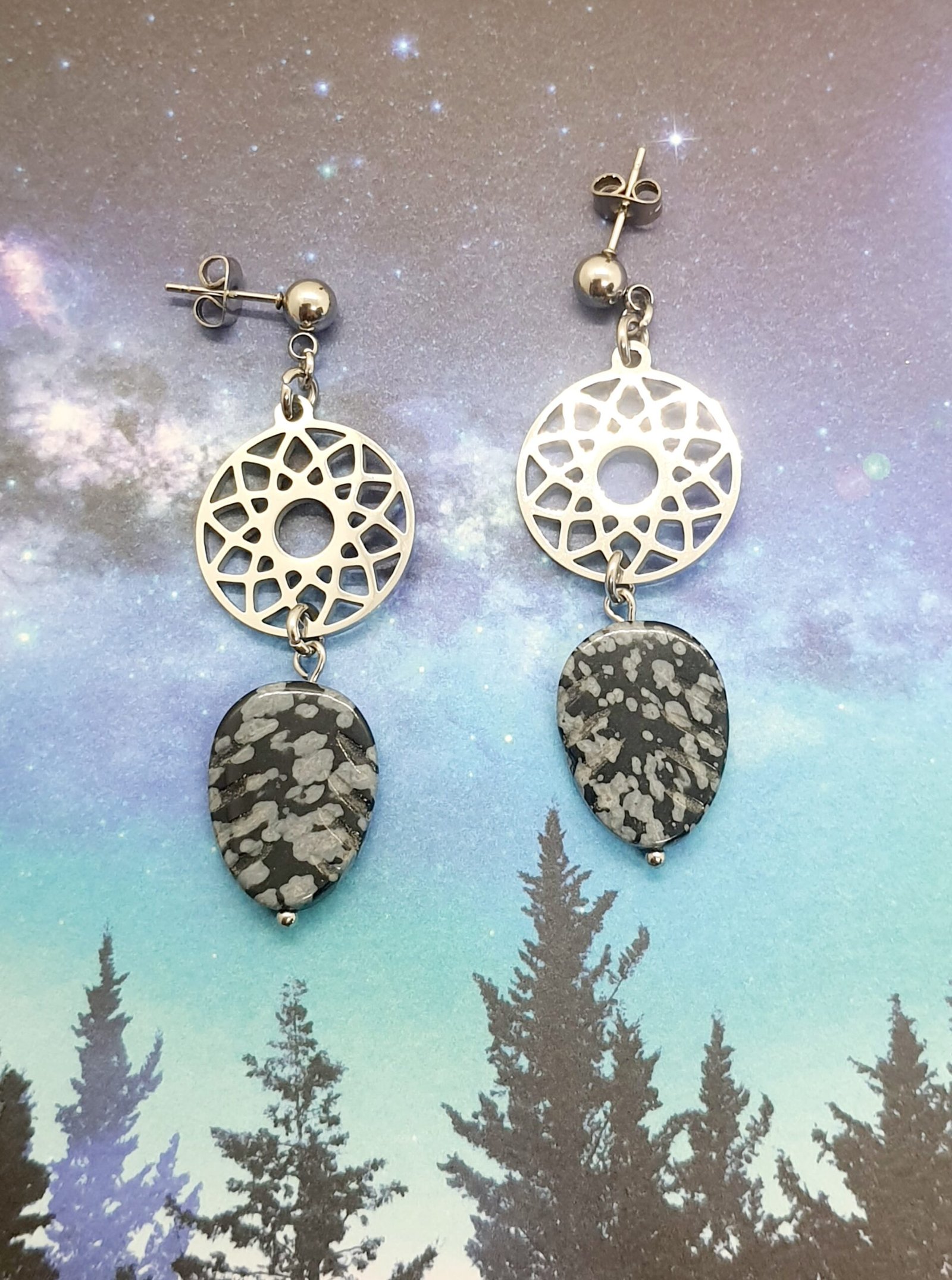 Boucles d’oreilles obsidienne mouchetée feuilles