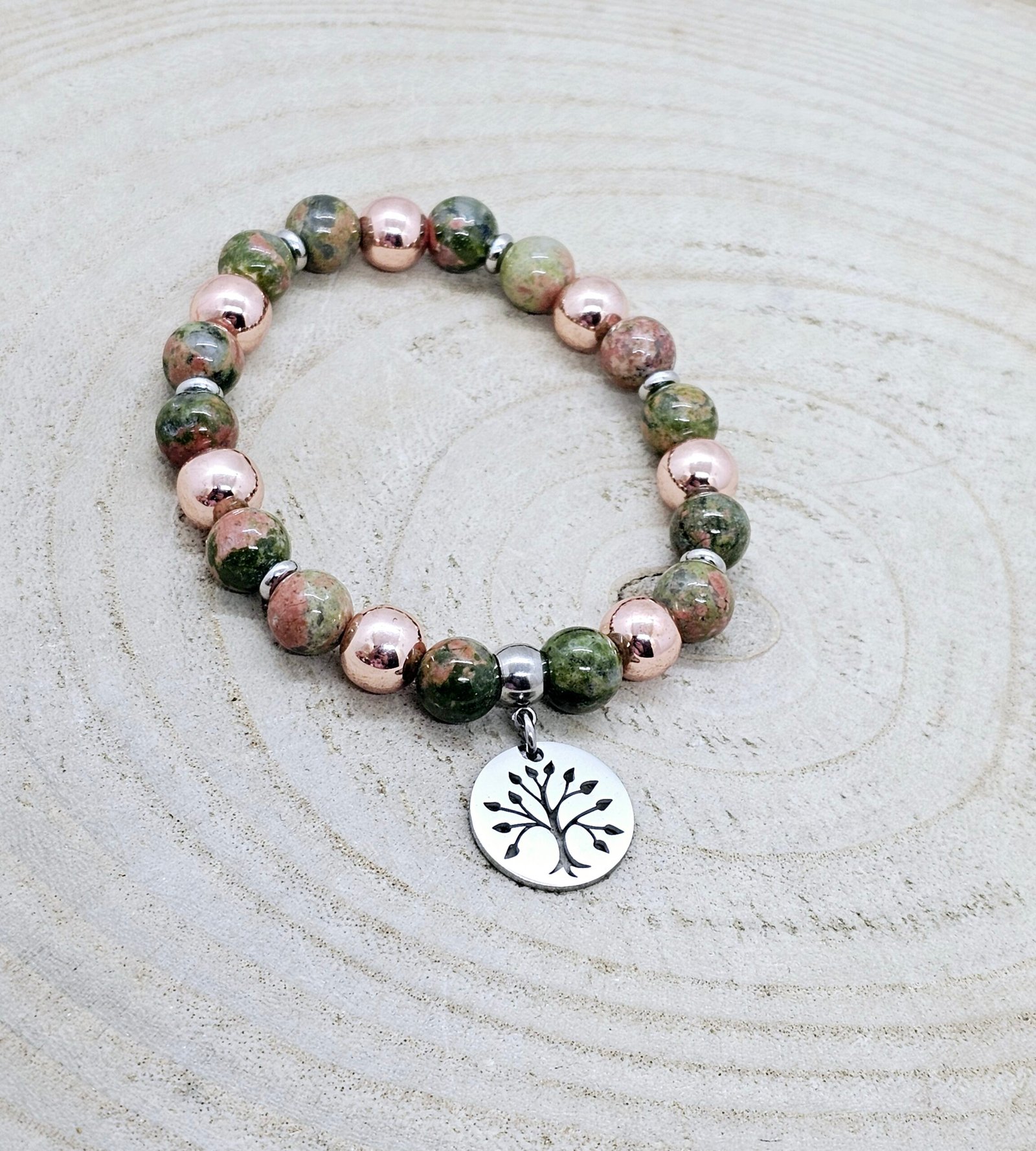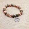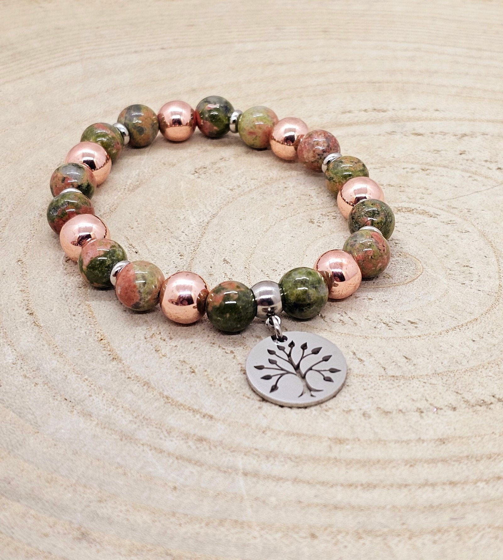 Le bracelet « Forêt Cuivrée » est composé de jaspe unakite et hématite plaquée en 8mm de diamètre.