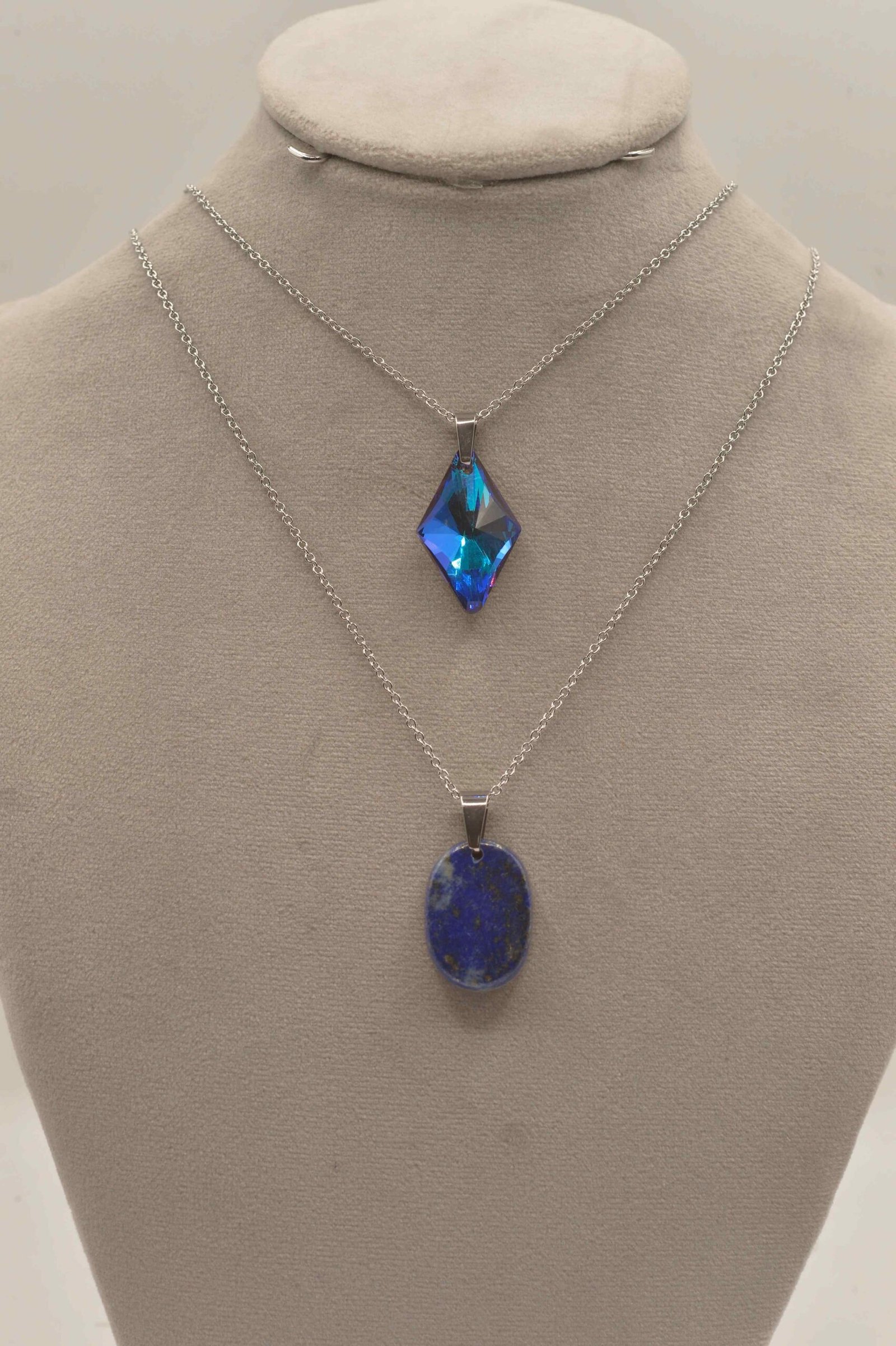 Acier inoxydable, longueur collier lapis lazuli 46cm, longueur collier cristal 35cm, pierre 3.5cm, réglable par chainette de 4cm