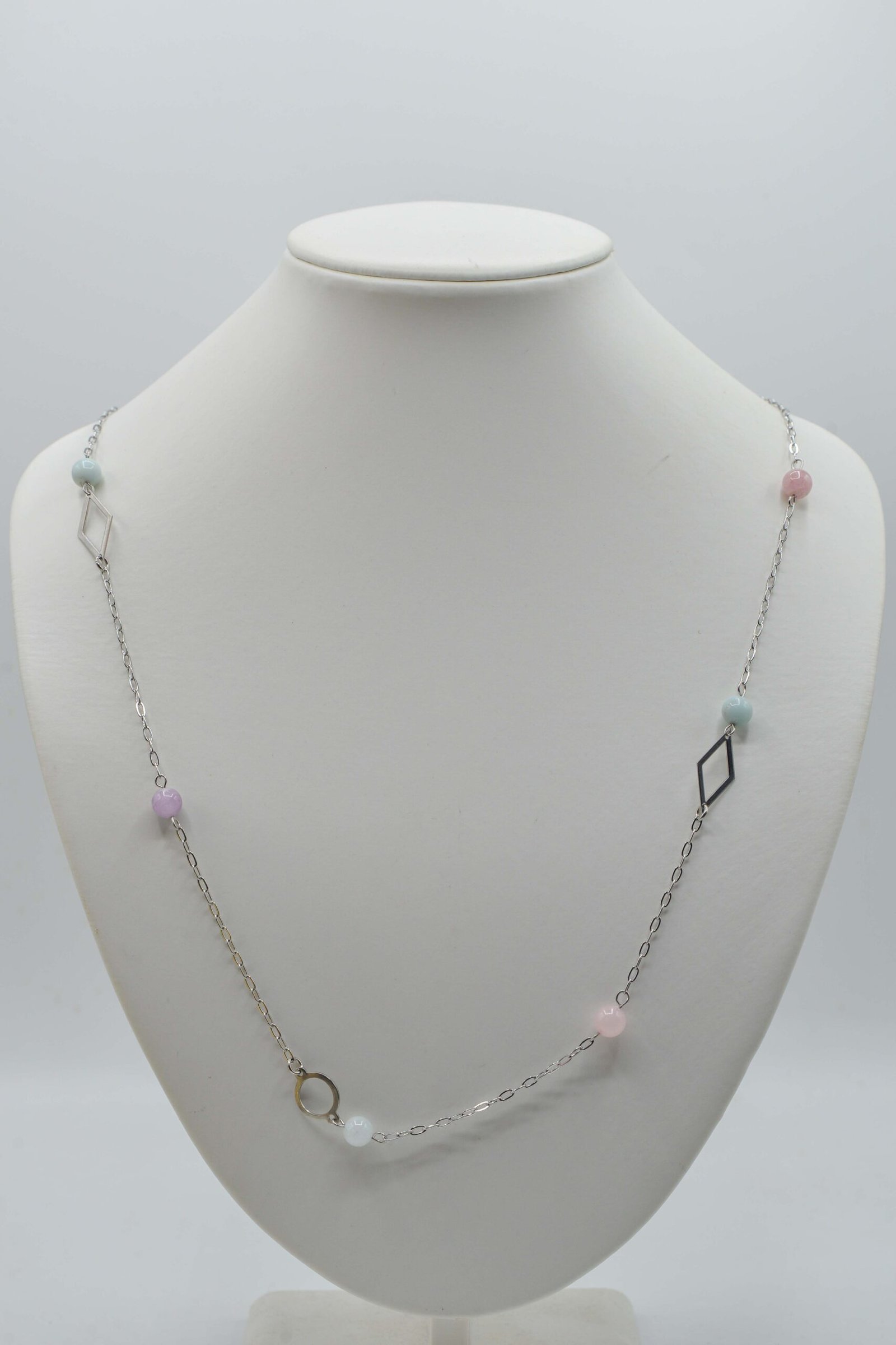 sautoir en acier inoxydable et kunzite, quartz rose, aigue-marine et amazonite