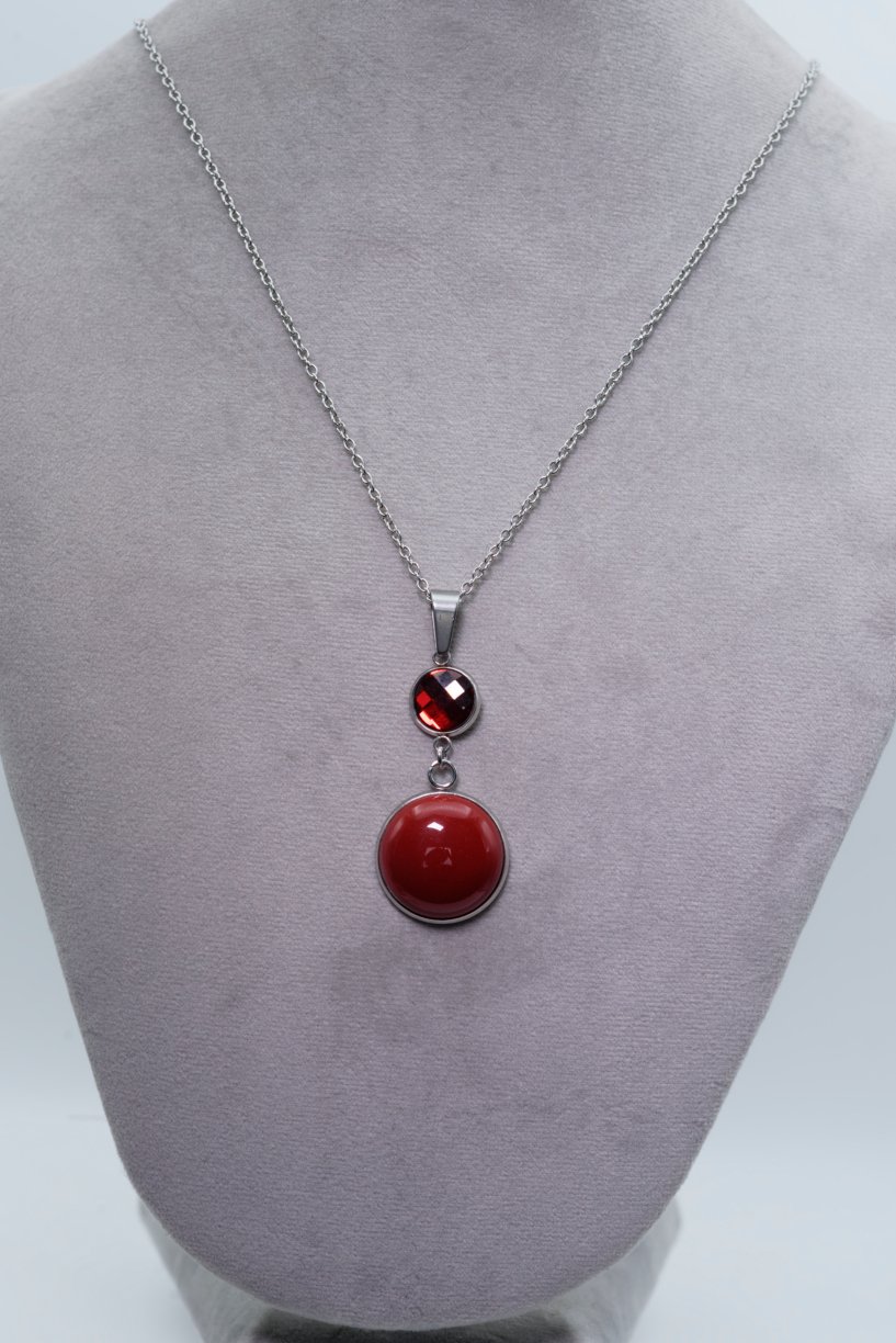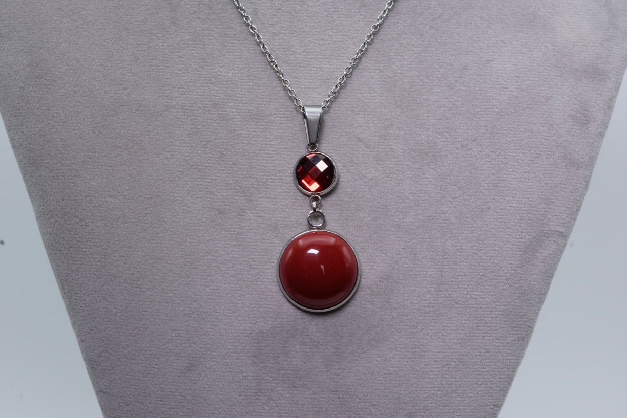 Acier inoxydable, cristal Swarovsky 10mm, jaspe 2.5cm, longueur hors bélière 4.5cm, chaine vendue séparément