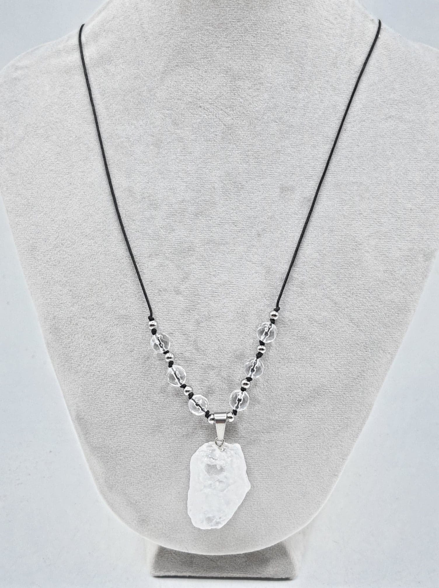 Acier inoxydable, Pierre 3cm, cristal de roche facetté 8mm, longueur hors pendentif 78cm