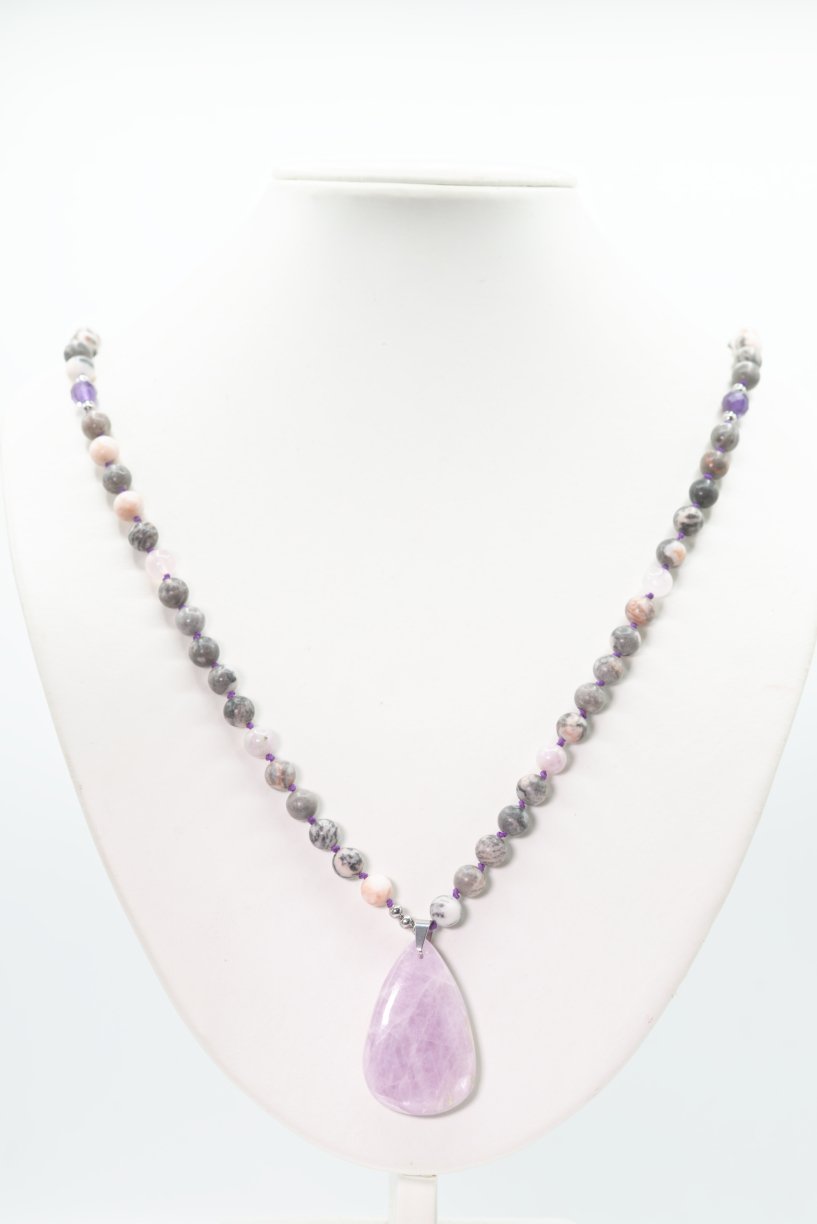 Acier inoxydable, pierres naturelles : Kunzite, Améthyste, Quartz rose, Jaspe zébré rose