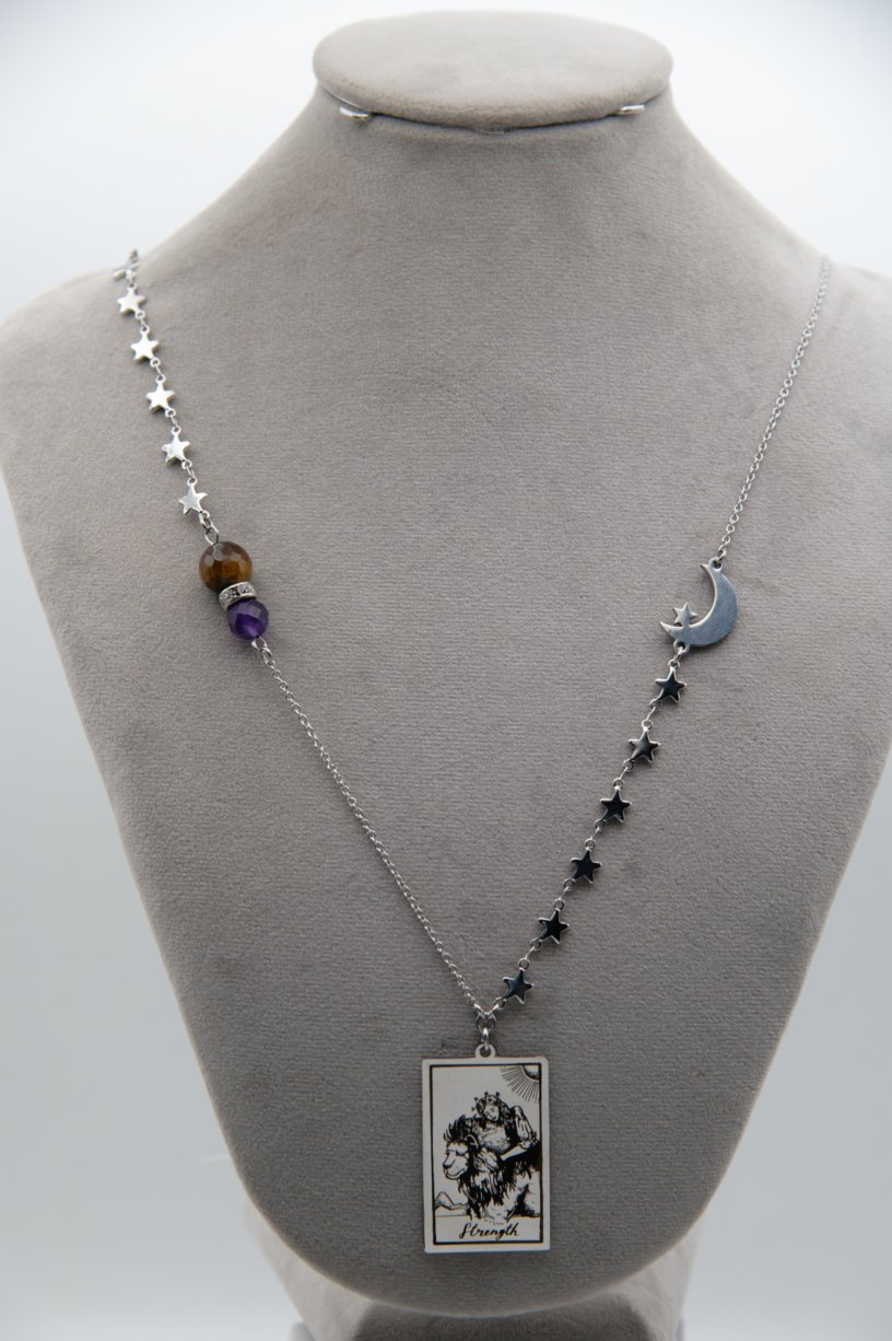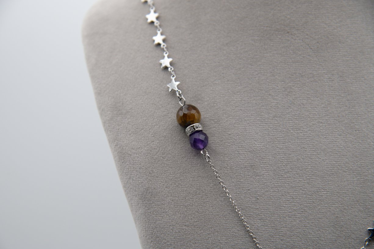 Acier inoxydable, oeil de tigre 10mm, améthyste 8mm, pierres facettées, longueur chaine 72cm